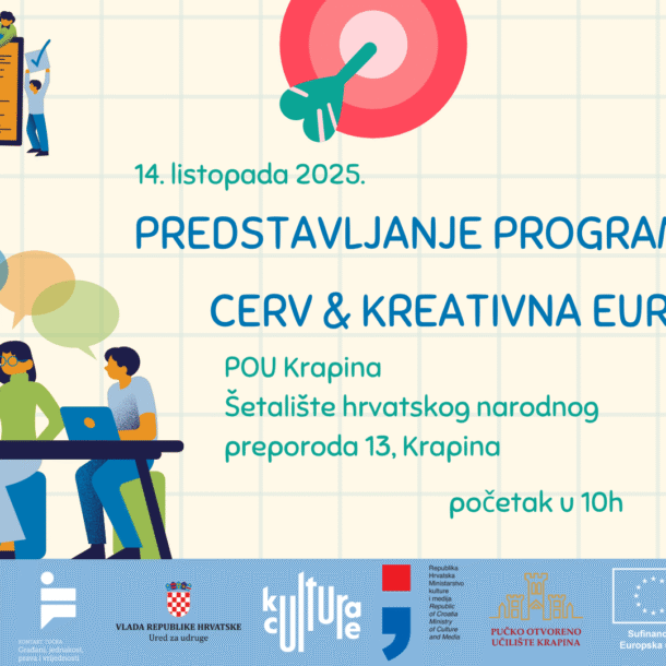 Nacionalna kontakt točka programa Unije Građani, jednakost, prava i vrijednosti (CERV) pri Uredu za udruge Vlade Republike Hrvatske, u suradnji s Deskom Kreativne Europe – Kultura pri Ministarstvu kulture i medija te Pučkim otvorenim učilištem Krapina, organizirala je predstavljanje programa Unije: Građani, jednakost, prava i vrijednosti (CERV) i Kreativna Europa – potprogram Kultura.